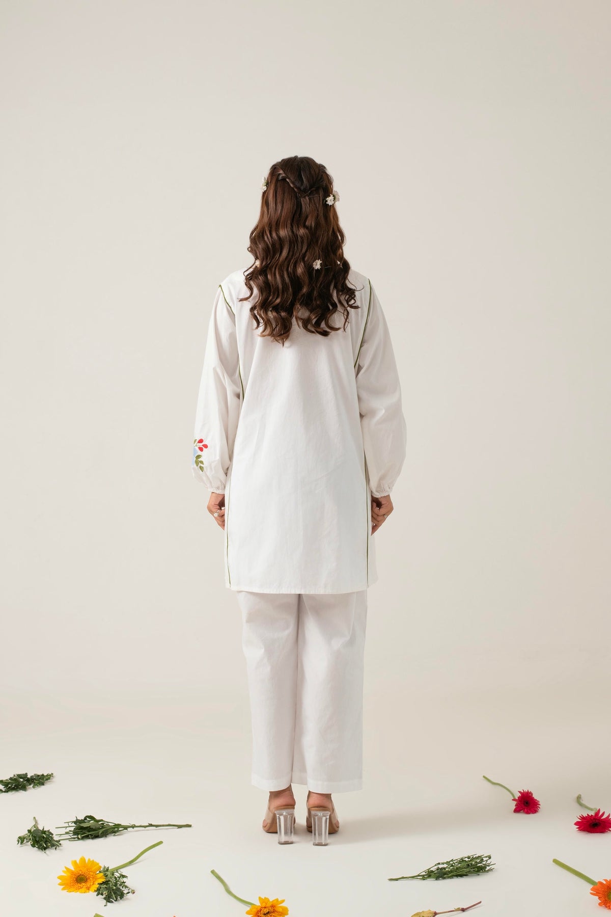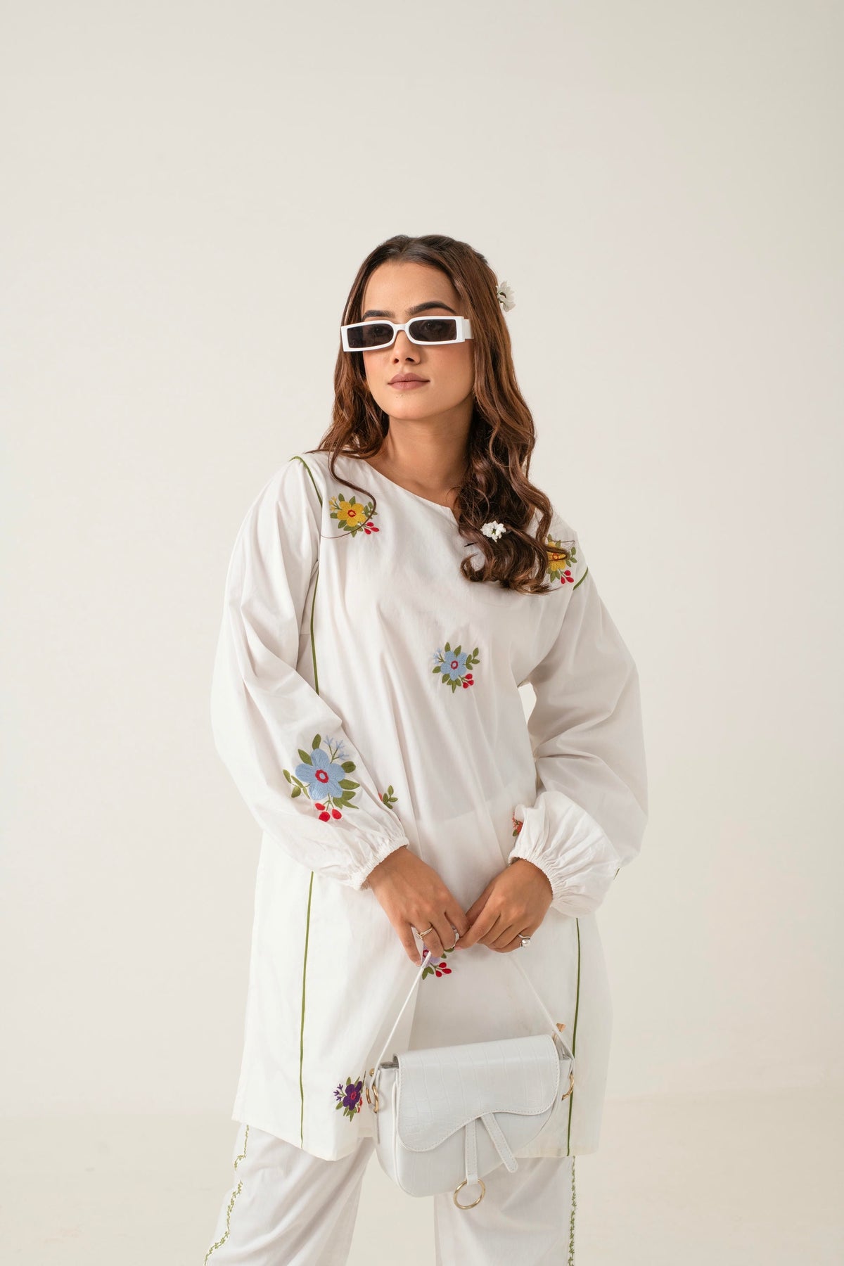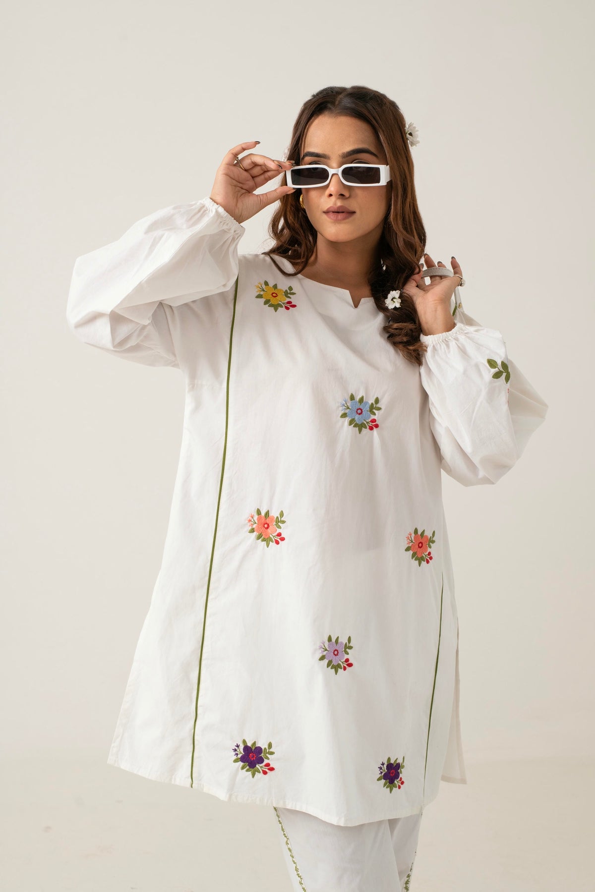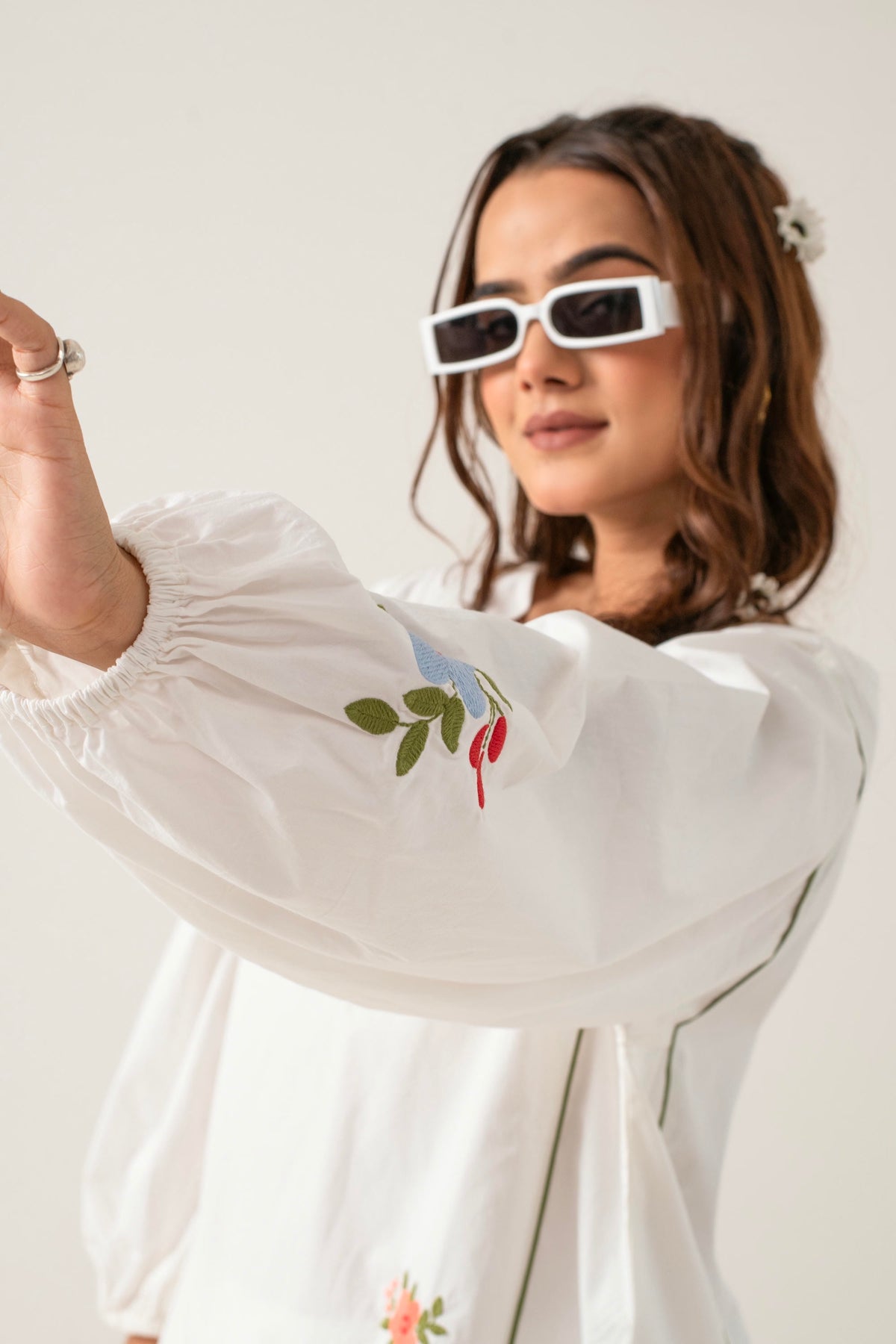 Amba is perfect for casual outings or relaxed social events, offering a chic and comfortable look. The puffed sleeves and floral details add a playful yet sophisticated touch, making it a versatile choice for a variety of occasions.